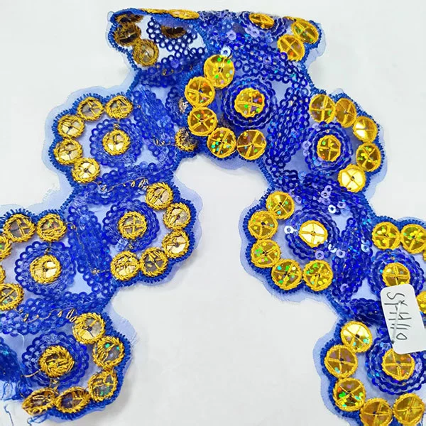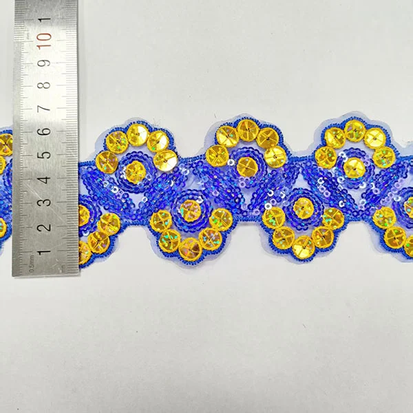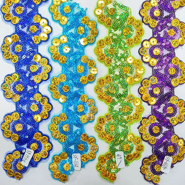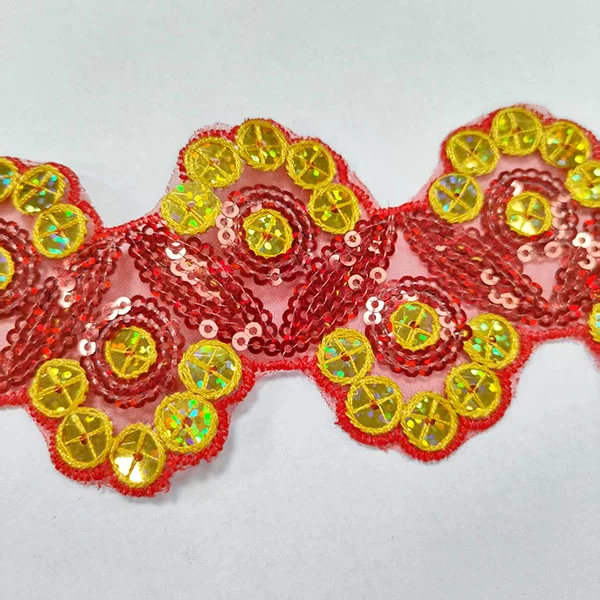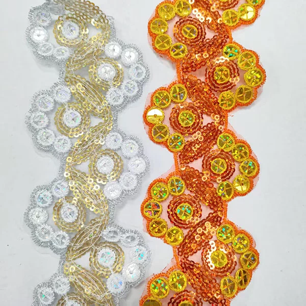 Tăierea din dantelă cu paiete multicolore de broderie este un tip decorativ de garnitură din dantelă care prezintă broderie complexă, paiete colorate și o bază de plasă. Acest tip de tuns este utilizat în mod obișnuit în designul vestimentar și meșteșuguri pentru a adăuga o notă de scânteie și glamour la articole de îmbrăcăminte, accesorii și articole de decor pentru casă.