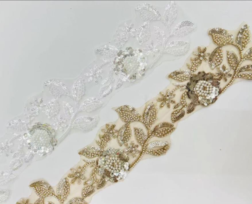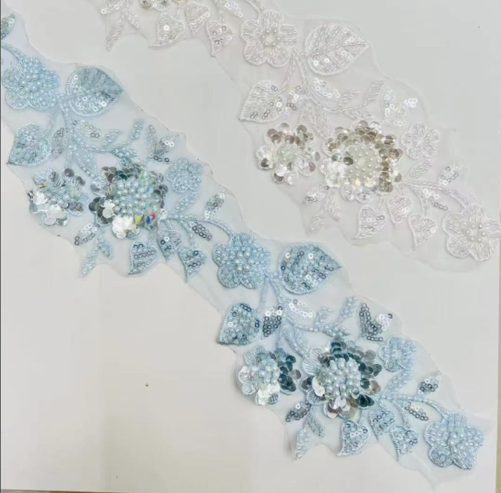 Noi sosiri de îmbrăcăminte decorativă cusut frumos tundele din dantelă cu perle cu perle împletite, adoptă un design combinat de țesuturi tridimensionale de frânghie, paiete strălucitoare și mărgele lustroase, cu straturi bogate și o atingere delicată. Este potrivit pentru decorațiuni de înaltă calitate, cum ar fi rochii de seară Haute Couture, rochii de mireasă, genți de seară și îmbrăcăminte de cap, îmbunătățind cu ușurință măreția obiectelor individuale.