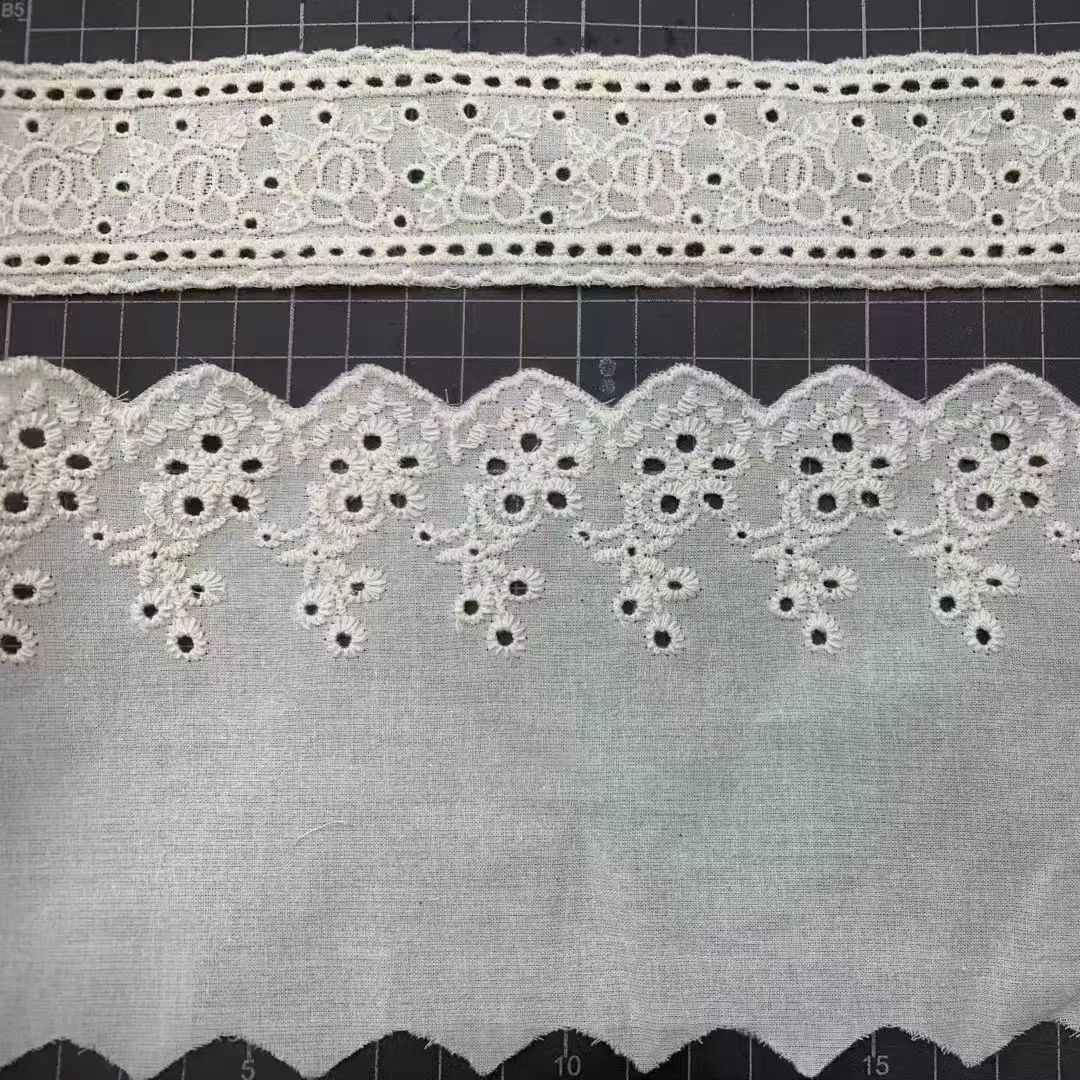Tăierea din dantelă de bumbac din bumbac broderie din dantelă de bumbac tuns floare t/c tuns din dantelă este confecționat dintr-un material de amestec de poliester (t/c), care este moale și respirabil, combinând durabilitatea poliesterului cu confortul bumbacului. Designul include o varietate de stiluri, cum ar fi dantelă brodată, decupaj floral și dantelă de plasă, potrivite pentru o tăiere rafinată și patchwork în îmbrăcăminte și decorare a casei. Oferă o varietate de opțiuni de lățime și culoare, acceptă personalizarea și ține cont atât de estetică, cât și de practic.